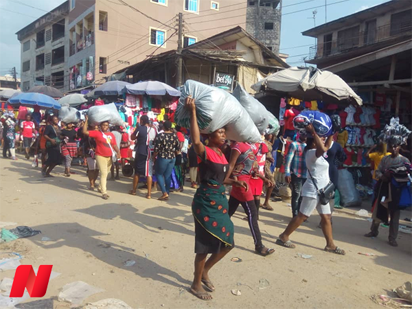 With their big bags on their heads, they all walk, moving the items they had bought from the Main Market around Upper Iweka.